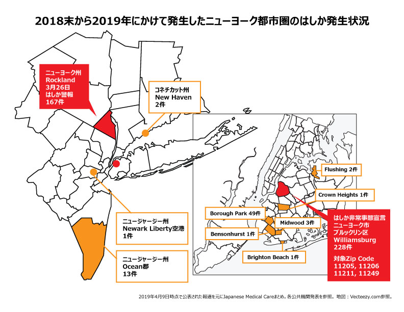 現在、ニューヨーク・トライステート(ニューヨーク州、ニュージャージー州、コネチカット州)をはじめ、全米で19州ではしかの症例が報告されております。